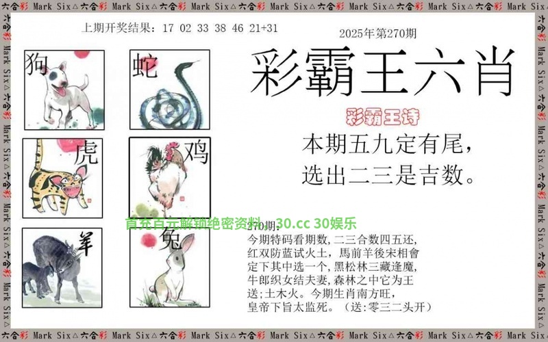 270期:正版彩霸王:本期五九定有尾,选出二三是吉数。 看生肖:今期送吉美开的生肖 七肖:鼠马蛇狗龙猪羊 |