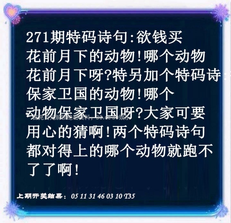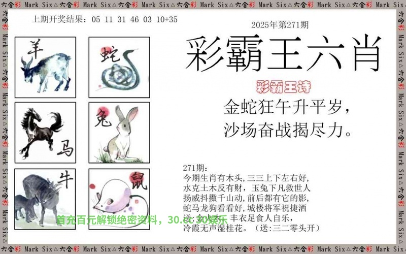 271期:正版彩霸王:金蛇狂午升平岁,沙场奋战揭尽力。 看生肖:今期送金肖开的生肖 七肖:兔鼠羊牛虎马猴 |