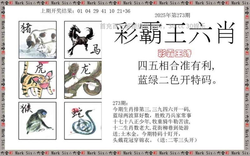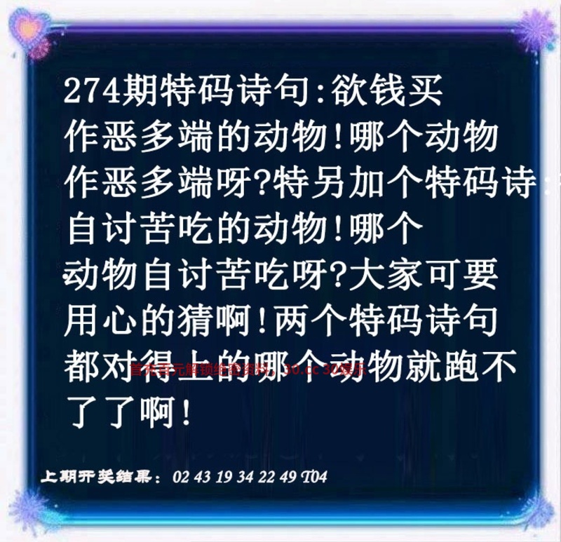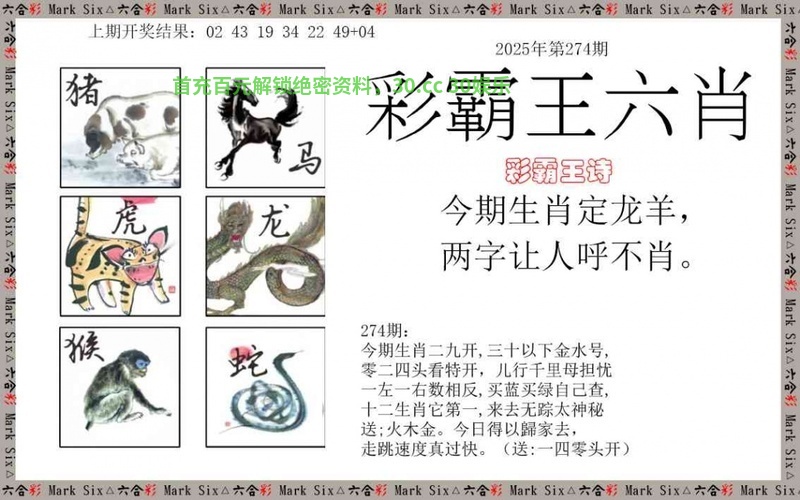 274期:正版彩霸王:今期生肖定龙羊,两字让人呼不肖。 看生肖:今期送吉美开的生肖 七肖:马狗猪鼠蛇兔虎 |